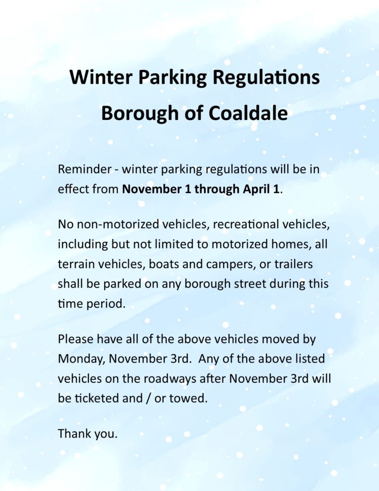 Winter Storm Reminders COALDALE BOROUGH REMINDERS Some points to remember regarding the impending snow storm this weekend. MOVE Read More »